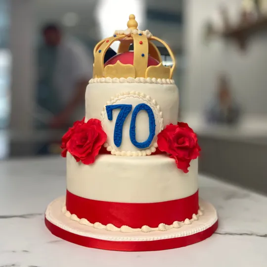 The layers were finished with a maple sugar coating and the cake was decorated with seven edible red roses and a royal blue ‘70’ badge, and topped with a gold pastillage crown.