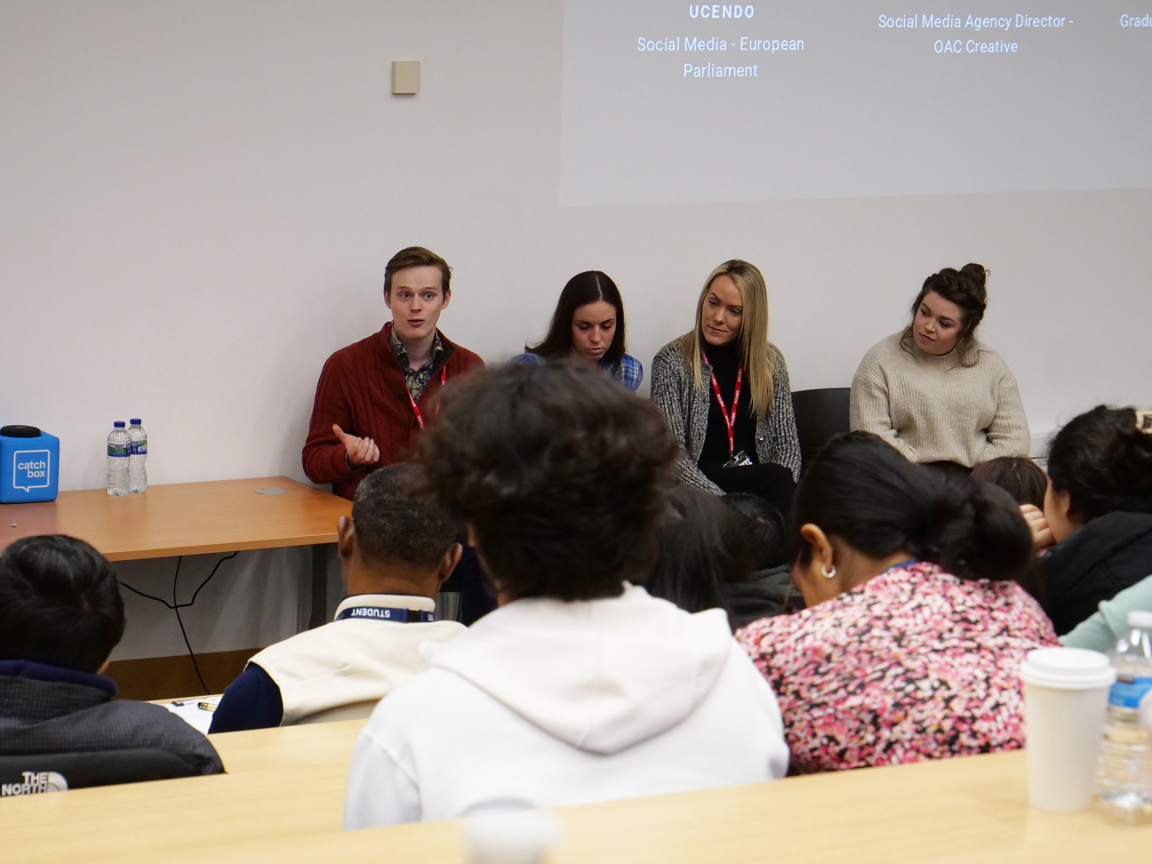 An alumni panel saw Charlie Hobbis, Social Media Agency Director, OAC Marketing; Tom Hall, Graduate Teaching Assistant, University of Gloucestershire; Hayley Phipps, Future Leader Graduate, British Airways; and Olivia Lori Iglesias Ucendo, Social Media Assistant, European Parliament answer questions from the eager audience on sustainability, the skills they’ve learned and starting a business.