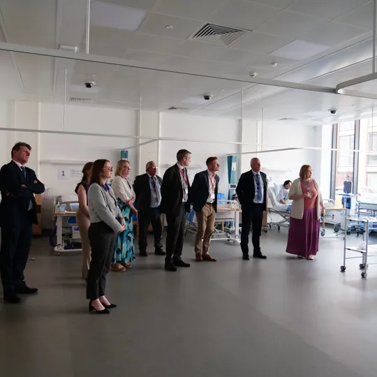 Lord Wharton visiting University College Birmingham's health simulation suite, complete with a six-bed hospital ward and simulation manikins.